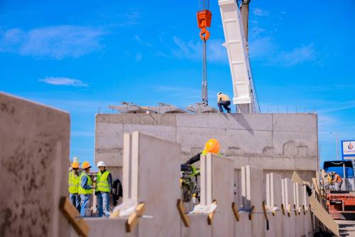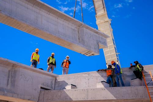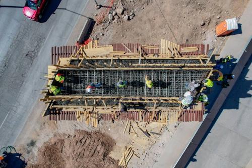 El Paso Superior Los Nogales e Industria presenta un avance del 34 por ciento; actualmente, en el cuerpo norte se realiza la colocación de 12 trabes de concreto reforzado como parte de la estructura principal del puente.