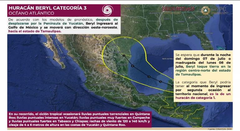 Laura Velázquez Alzúa, coordinadora nacional de Protección Civil, dio a conocer que el huracán Beryl ha sido degradado a categoría 3 y se espera que impacte en territorio mexicano en las próximas horas.