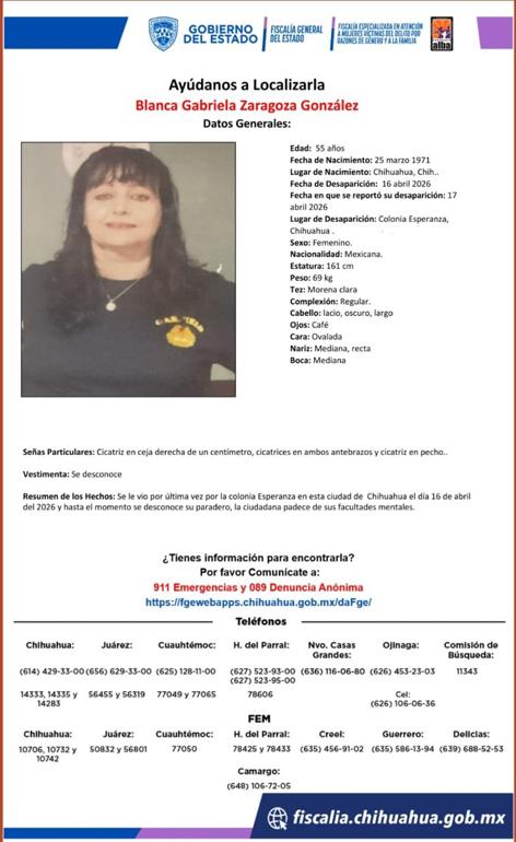 Buscan a Blanca Gabriela Zaragoza González, de 55 años, desaparecida el 16 de abril en la colonia Esperanza, en Chihuahua; autoridades piden apoyo urgente para localizarla.