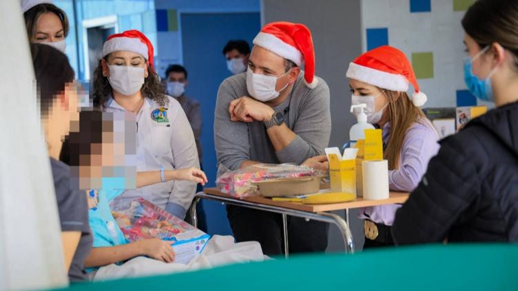 El presidente municipal de Chihuahua, Marco Bonilla, acompañado por la presidenta del DIF Municipal, Karina Olivas, visitó el Hospital Morelos previo a la Navidad para acompañar a las familias que permanecen en el nosocomio mientras uno de sus seres queridos recibe atención médica.
