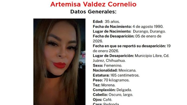 La Fiscalía del Estado emitió la pesquisa de Artemisa Valdez Cornelio, originaria de Durango y desaparecida desde ayer 19 de enero del 2026 en la colonia Municipio Libre en Ciudad Juárez.