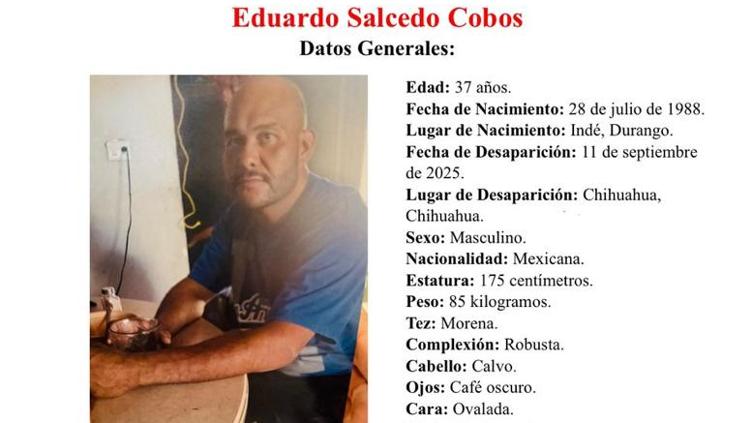 La Fiscalía de Chihuahua busca a Eduardo Salcedo Cobos, desaparecido el 11 de septiembre de 2025; tiene 37 años, tatuaje en el antebrazo izquierdo y usa barba de candado, entre otras señas.