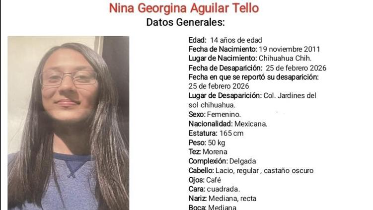 Nina Georgina Aguilar Tello, de 14 años de edad, desapareció en la colonia Jardines del Sol. La Fiscalía General del Estado publicó su pesquisa.