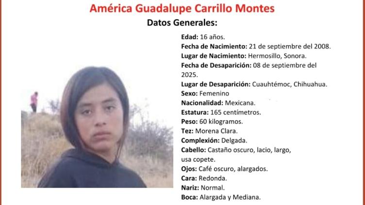 América Guadalupe Carrillo Montes, de 16 años, está desaparecida desde el 8 de septiembre en Cuauhtémoc, Chihuahua. Fue vista por última vez en la colonia Tierra Nueva y se desconoce su paradero. Se solicita ayuda al 911 para cualquier información.