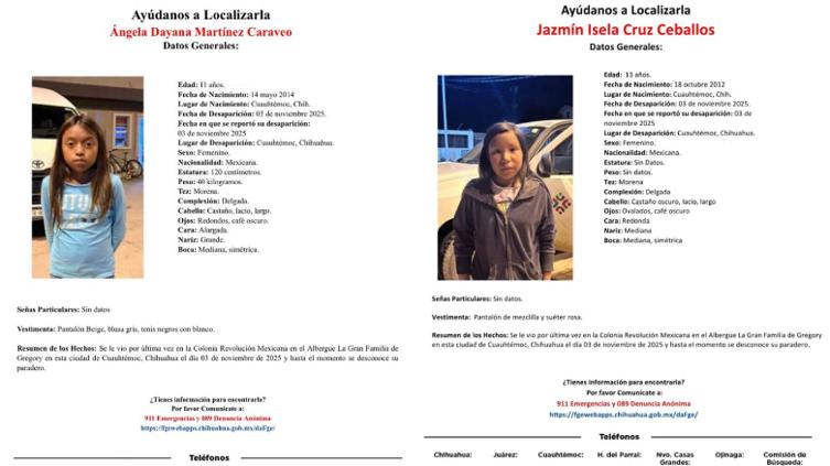 La Fiscalía General del Estado de Chihuahua, a través de la Fiscalía Especializada en Atención a Mujeres Víctimas del Delito por Razones de Género y la Familia (FEM), emitió una alerta de búsqueda para localizar a Ángela Dayana Martínez Caraveo, de 11 años, y Jazmín Isela Cruz Ceballos, de 13, quienes fueron vistas por última vez el 3 de noviembre de 2025 en la Colonia Revolución Mexicana, en el municipio de Cuauhtémoc.
