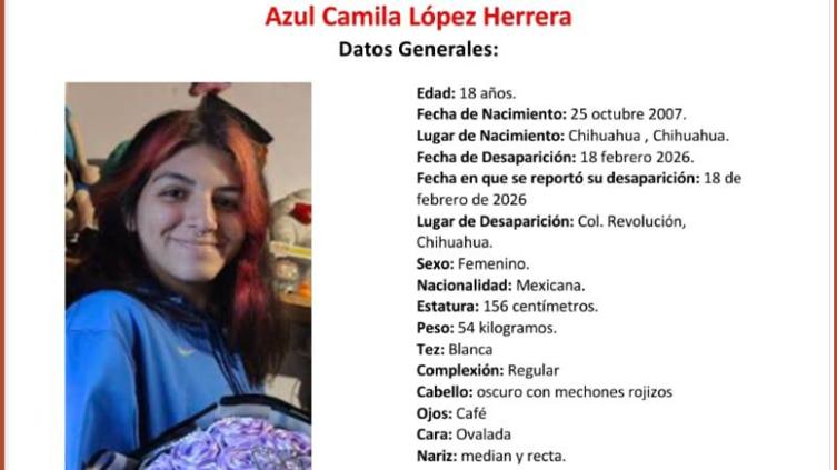 Autoridades del estado emitieron una ficha de búsqueda para localizar a Azul Camila López Herrera, de 18 años de edad, quien fue vista por última vez el 18 de febrero de 2026 en la colonia Revolución, en la ciudad de Chihuahua.