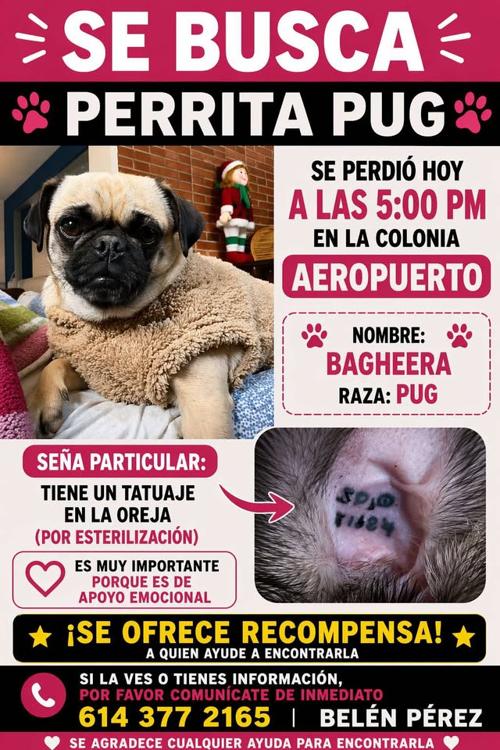 Hasta la redacción de Tiempo.com.mx, llegó la solicitud para buscar a una perrita de compañía llamada Bagheera que se perdió en la colonia Aeropuerto.