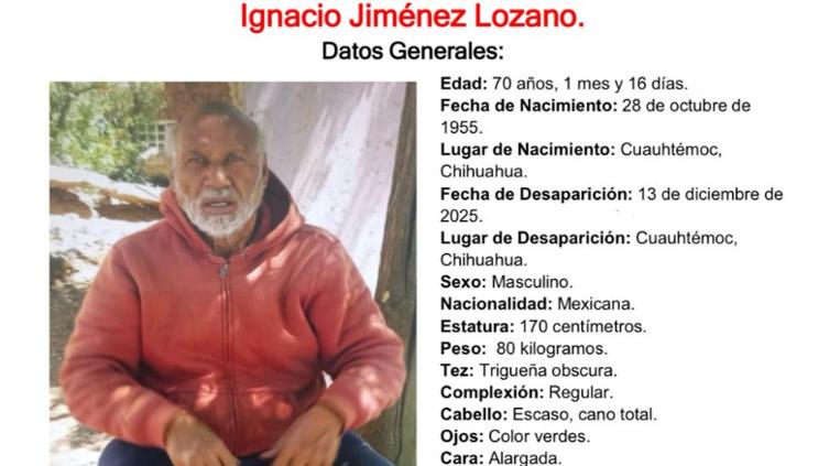De acuerdo con la información oficial, Ignacio Jiménez Lozano nació el 28 de octubre de 1955 en Cuauhtémoc, Chihuahua. Fue visto por última vez el 13 de diciembre de 2025 en el mismo municipio y, desde ese momento, se desconoce su paradero.