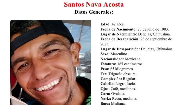 La Fiscalía General del Estado emitió una alerta de búsqueda para Santos Nava Acosta, de 42 años, quien fue reportado como desaparecido tras ser visto por última vez el pasado 23 de septiembre de 2025 en la ciudad de Delicias. Desde entonces, se desconoce su paradero.