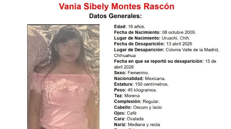 Autoridades estatales emitieron una ficha de búsqueda para localizar a Vania Sibely Montes Rascón, una adolescente de 16 años reportada como desaparecida en la ciudad de Chihuahua.