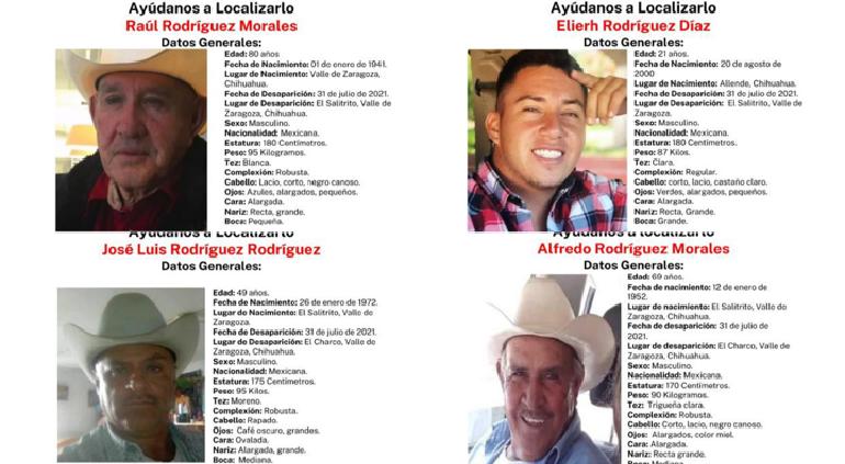 Se trata de Elierh Rodríguez Díaz, de 21 años, José Luis Rodríguez Rodríguez, de 49 años, Alfredo Rodríguez Morales, de 69 años y Raúl Rodríguez Morales, de 80 años, quienes desaparecieron el 31 de julio de 2019.