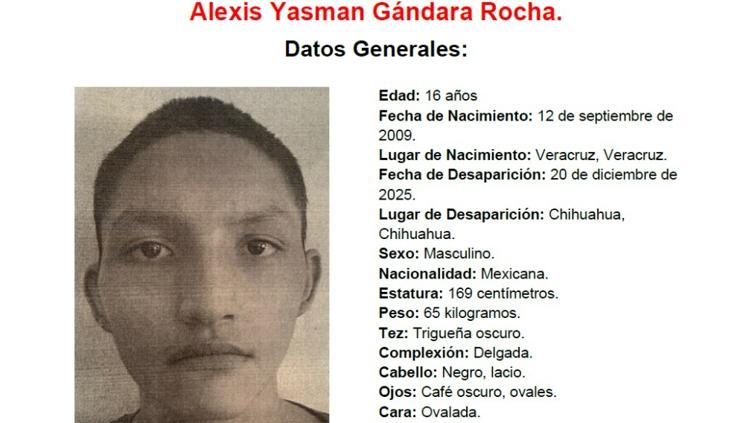 La Fiscalía de Chihuahua busca a Alexis Yasman Gándara Rocha, de 16 años, extraviado el 20 de diciembre de 2025 al salir del Centro CRRAV; se detallan sus características físicas, tatuaje de Santa Muerte y vestimenta.