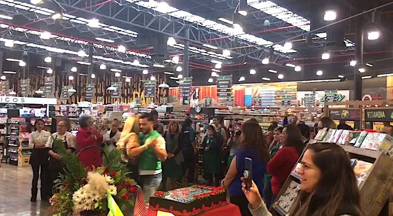 Cientos de clientes vieron con sorpresa el recibimiento y mostraban sonrisas al ritmo de la tambora, mientras que aprovecharon para tomar fotos con los teléfonos.