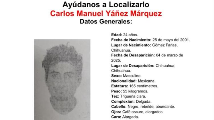 La Fiscalía solicita ayuda para encontrar a Carlos Manuel Yáñez Márquez de 24 años, quien desapareció el 4 de marzo del presente año en la colonia Las Torres. Por ahora se desconoce su paradero.