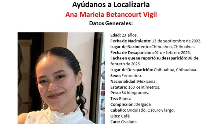 Autoridades estatales solicitan el apoyo de la ciudadanía para localizar a Ana Mariela Betancourt Vigil, joven de 23 años de edad, quien fue reportada como desaparecida en la ciudad de Chihuahua.