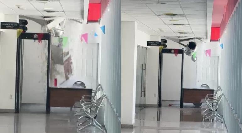 En las imágenes se puede observar como el agua caía del techo y justo en el momento que cierran la puerta se desplomó el plafón por el peso del agua.