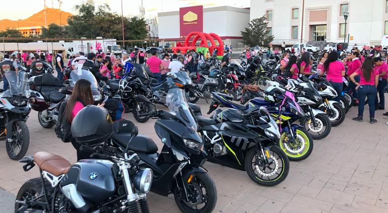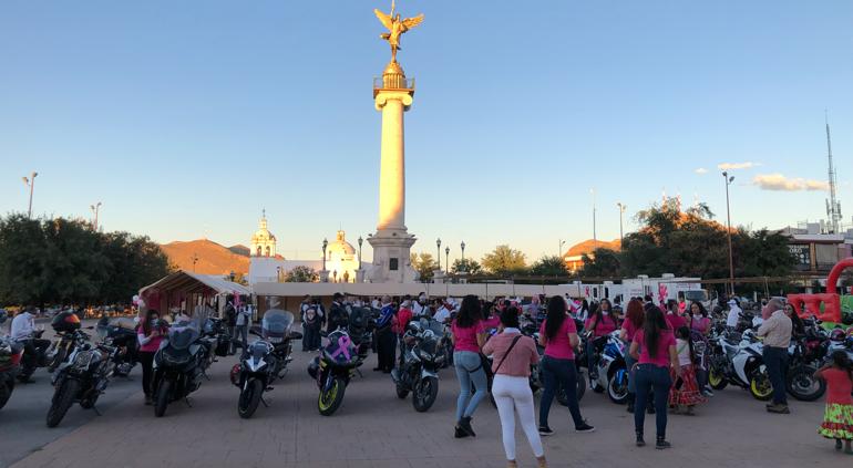 Esta tarde caravana de mujeres bikers recorrieron distintas calles de la ciudad de Chihuahua en conmemoración del Día Mundial de la Lucha contra el Cáncer de Mama, donde llegaron a la Plaza del Ángel y se finalizó con las atenciones brindadas por la Secretaría de Salud durante este día.