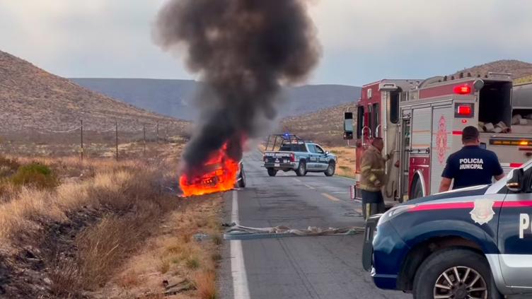 Falla mecánica provoca incendio vehicular en carretera Aldama- Ojinaga