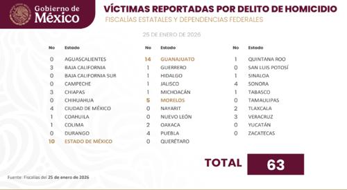 Específicamente, el reporte del día 25 de enero contabiliza a nivel nacional 63 víctimas por delito de homicidio, lo cual resulta por encima del promedio en lo que va del mes de 47.9.