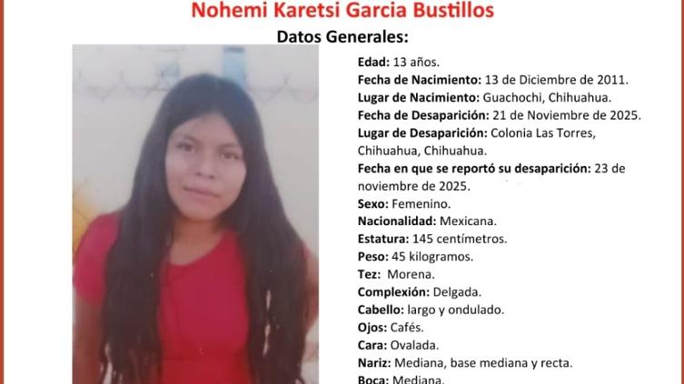 La Fiscalía General del Estado de Chihuahua activó los protocolos de busqueda para buscar a Nohemí Karetsi García Bustillos, una joven de 13 años desaparecida desde el 21 de noviembre de 2025 en la colonia Las Torres. La menor fue vista por última vez en esa zona, y su familia reportó el hecho dos días después, lo que movilizó de inmediato a las autoridades estatales.