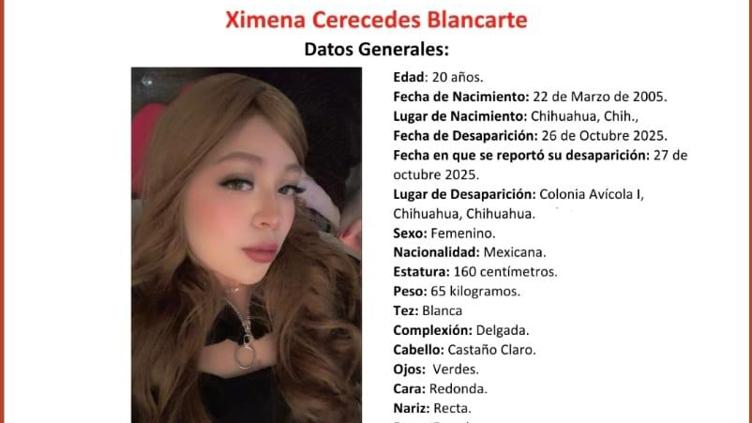 La Fiscalía General del Estado emitió una ficha de búsqueda urgente para localizar a Ximena Cerecedes Blancarte, de 20 años, desaparecida desde el 26 de octubre en la Colonia Avícola I de Chihuahua capital.