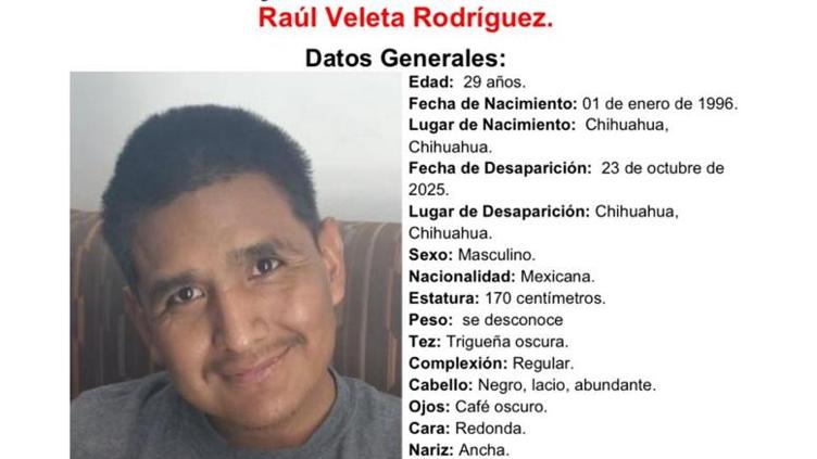 Las autoridades de Chihuahua han lanzado un llamado a la población para localizar a Raúl Veleta Rodríguez, de 29 años, quien fue visto por última vez el 23 de octubre de 2025 en la Colonia el Porvenir.