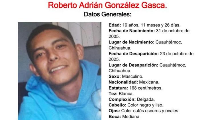 Las autoridades de Chihuahua han emitido un aviso para localizar a Roberto Adrián González Gasca, un joven de 19 años, 11 meses y 26 días, reportado como desaparecido desde el 23 de octubre de 2025 en Cuauhtémoc.