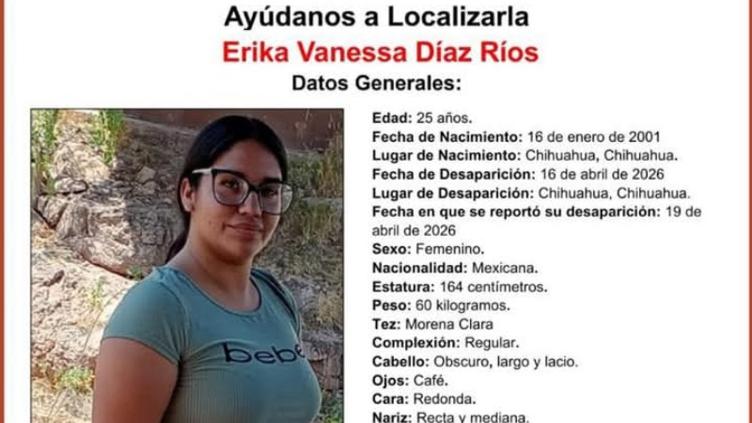Erika Vanessa Díaz Ríos de 25 años, desapareció hace cinco días en la ciudad de Chihuahua. Desde ese día su familia no sabe nada de ella y por ello piden ayuda a la ciudadanía para localizarla sana y salva.