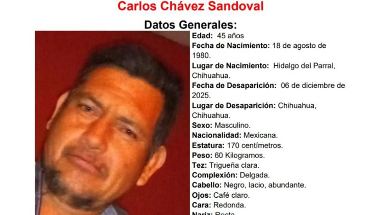 La Fiscalía solicita ayuda para encontrar al parralense Carlos Chávez Sandoval de 45 años, quien desapareció el 6 de diciembre del presente año en la ciudad de Chihuahua. Por ahora se desconoce su paradero.