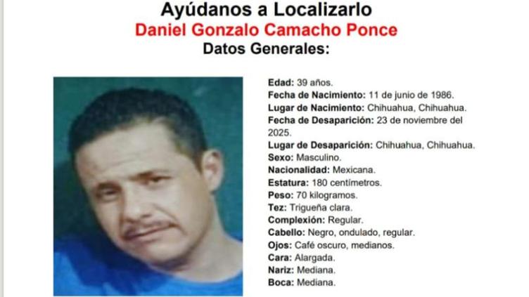 La Fiscalía solicita ayuda para encontrar a Daniel Gonzalo Camacho Ponce de 39 años, quien desapareció el 23 de noviembre luego de salir de su casa en la colonia La Villa. Por ahora se desconoce su paradero.