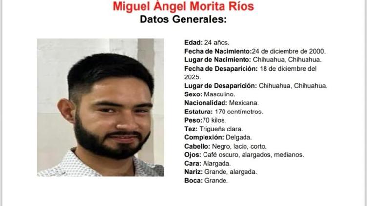 La Fiscalía de Chihuahua busca a Miguel Ángel Morita Ríos, de 24 años, desaparecido el 18 de diciembre de 2025 en la colonia Valle; se describe su apariencia física, vestimenta y señas particulares.