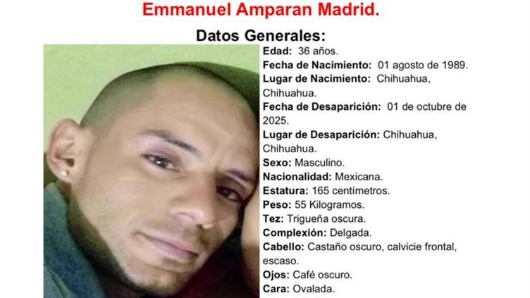 Emmanuel Amparan Madrid, de 36 años, desapareció el 1 de octubre de 2025 en Chihuahua, Chihuahua. Según la Fiscalía General del Estado, la última vez que se le vio fue cuando salió de su domicilio en la Colonia Panorámico. No se tienen más datos sobre su paradero.