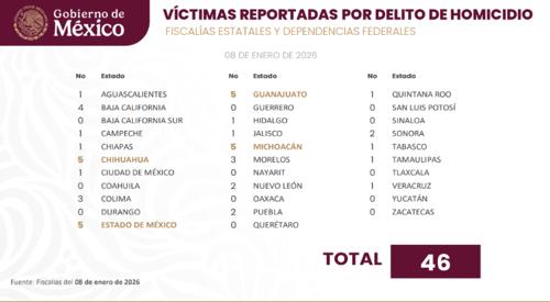 Específicamente, en el reporte del primer día del año, la SSPC refiere que en el país registraron 46 casos preliminares de homicidio, cifra que está por encima del promedio de lo que va de enero: 48.8.