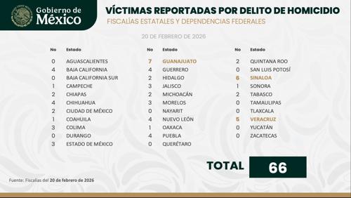 El estado de Chihuahua registró cuatro homicidios dolosos durante el viernes 20 de febrero, de acuerdo con el informe diario del Gobierno de México, elaborado con datos recabados por fiscalías estatales y dependencias federales. En el conteo nacional, Guanajuato encabezó la lista con siete casos, seguido de Sinaloa con seis y Veracruz con cinco.