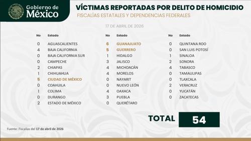 A nivel nacional, el reporte diario contabilizó un total de 54 homicidios, reflejando la distribución de la violencia en distintas entidades del país durante esa jornada.
