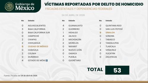 La SSPC reportó que Chihuahua registró solo dos homicidios el viernes 24 de abril, mientras Sinaloa encabezó la lista nacional con nueve asesinatos y el país sumó 53 casos.