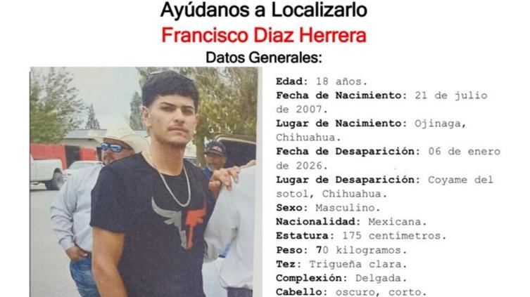 La Fiscalía solicita ayuda para encontrar al joven Francisco Díaz Herrera de 18 años quien desapareció el 6 de enero del presente año luego de salir rumbo a su casa en Coyame del Sotol. Por ahora se desconoce su paradero.