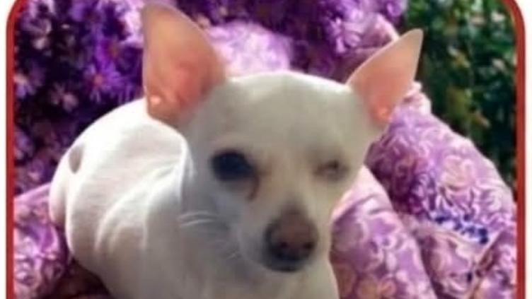 “Princesa” es de raza chihuahua, es de color blanca con beige, le falta el ojito derecho y no sabe andar solita en la calle solita, por eso y por el hecho de que está en tratamiento de cáncer sus dueños están muy preocupados por ella.
