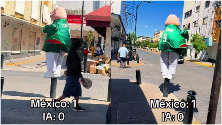 En el video, se puede leer la leyenda “México: 1 / IA: 0”, mientras se puede ver a la botarga del Doctor Simi vestida con un jersey de la selección mexicana arriba del bolardo bailando al ritmo de la música.