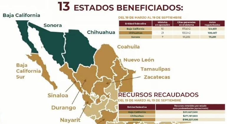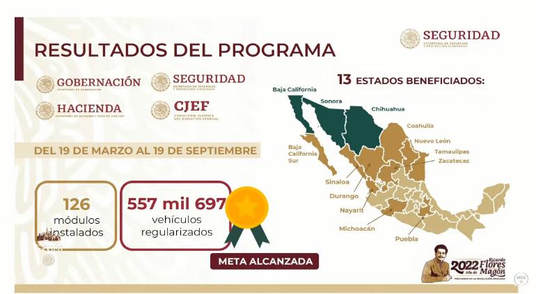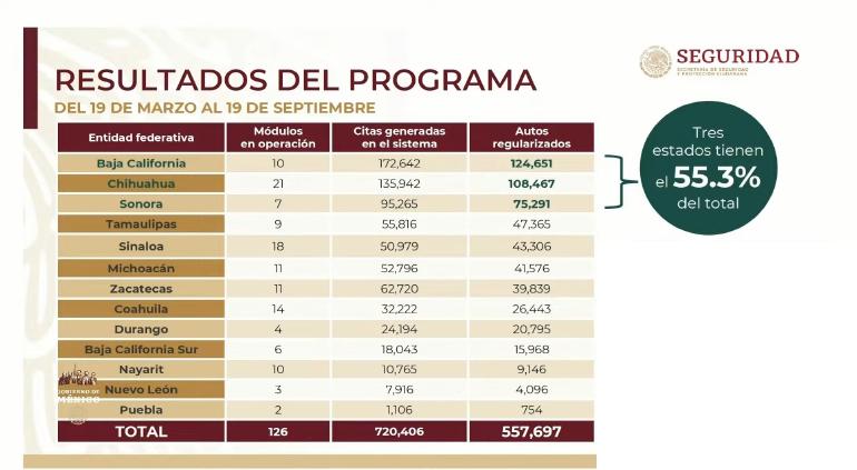 A nivel nacional se regularizaron 557,697 vehículos, a través de 126 módulos instalados en el país, principalmente en estados con frontera a Estados Unidos.