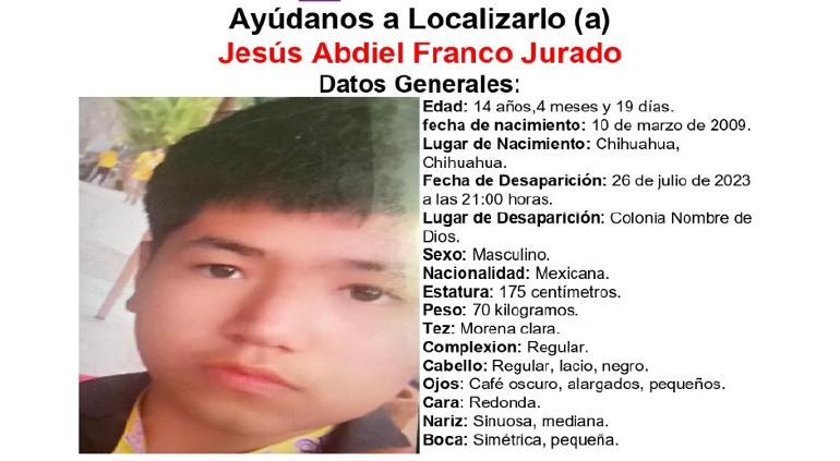 La Fiscalía y familiares solicitan ayuda para encontrar a Jesús Abdiel Franco Jurado de 14 años, quien desapareció el 26 de julio del presente año al salir en la noche de su casa en la colonia Nombre de Dios en Chihuahua.