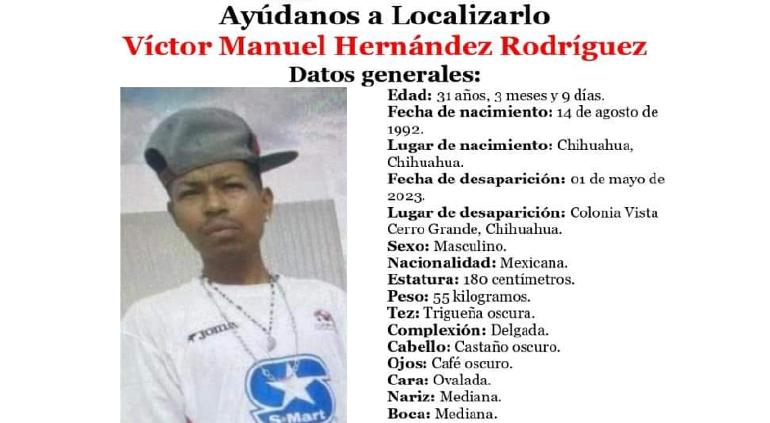 La Fiscalía y familiares solicitan ayuda para encontrar a Víctor Manuel Hernández Rodríguez de 31 años, quien desapareció el 1 de mayo del presente año luego de salir de su casa en la colonia Vista Cerro Grande en Chihuahua, desde entonces se desconoce su paradero.