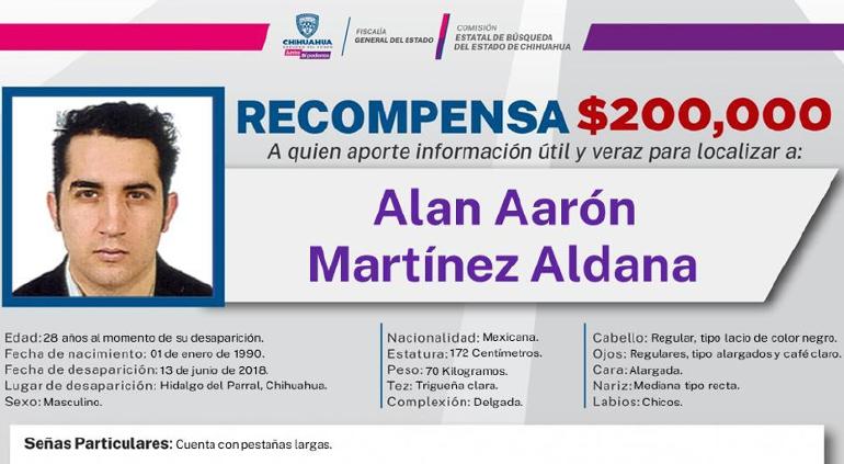 Alan Aarón Martínez Aldana desapareció el 13 de junio del 2018 cuando tenía 28 años en Parral. Desde entonces se desconoce dónde está por lo que la Fiscalía informó que ofrecen 200 mil pesos de recompensa a quien sepa algo de él.