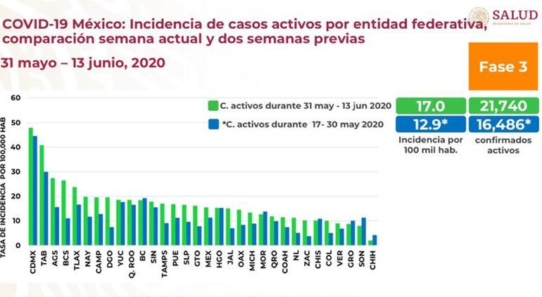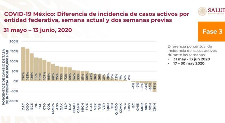 Las gráficas muestran la diferencia de casos activos por entidad federativa entre las semanas del 17 al 30 de mayo y del 31 de mayo al 13 de junio, tiempo en el que bajó la incidencia de coronavirus en un 53% en el estado de Chihuahua.