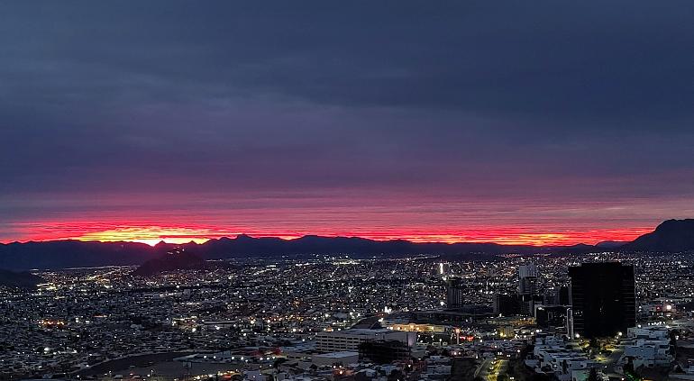 Los senderistas de la ciudad de Chihuahua, lograron captar el hermoso y morado amanecer desde el cerro El Mogote, en el que se logran ver bellos tonos morados, lilas y rosas durante la salida del sol.