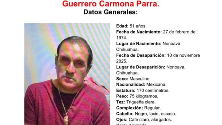 La Fiscalía solicita ayuda para encontrar al señor Guerrero Carmona Parra de 51 años, quien desapareció el 10 de noviembre del presente año en Nonoava. Por ahora se desconoce su paradero.