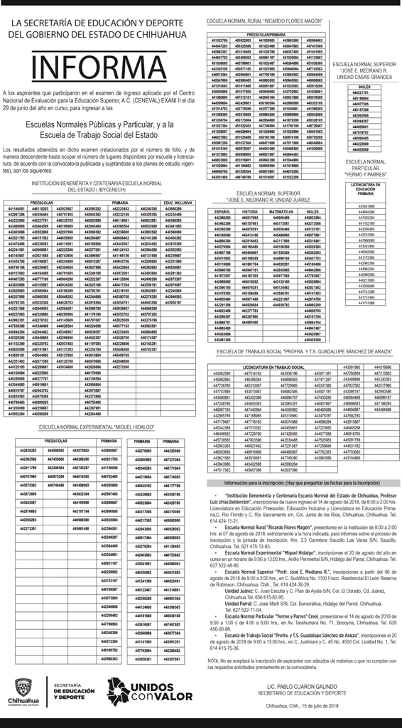 A través de los principales periódicos de circulación estatal, así como en la página Web https://www.facebook.com/secretariaeducacionchihuahua/, se pueden ver los resultados.