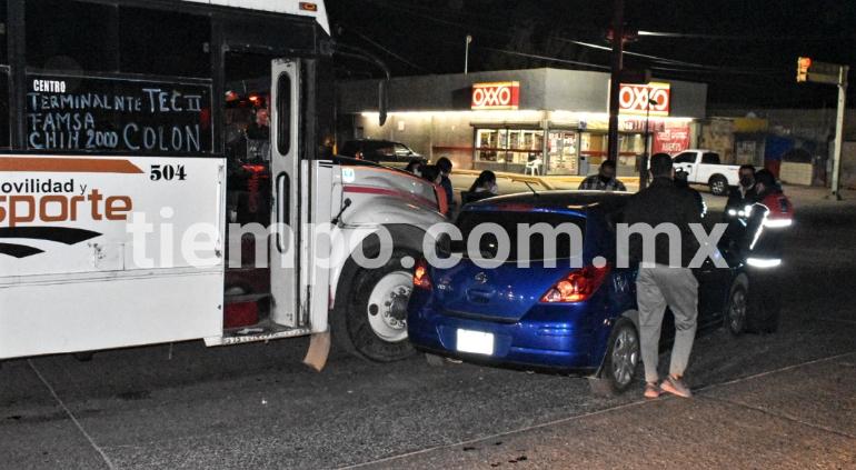 El accidente ocurrió cuando el chofer de un camión urbano de la ruta Tec II con número económico 504 terminó por impactarse contra un automóvil Nissan Tiida de color azul.
