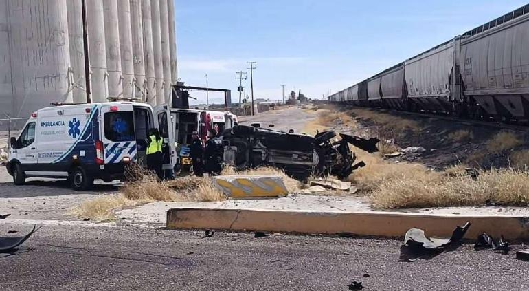 Dos adultos mayores resultaron lesionados tras impactar contra el tren y volcar cuando viajaban en una camioneta Kia en las inmediaciones del kilómetro 9 de la carretera Camargo a Jiménez.