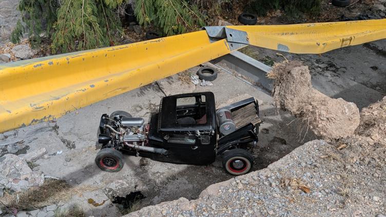 Un hombre de unos 40 años perdió el control de su Ford Hot Rod negro V8 al virar en la calle Yucatán; el vehículo cayó al canal y destruyó la barda; policías viales y Cruz Roja atendieron.